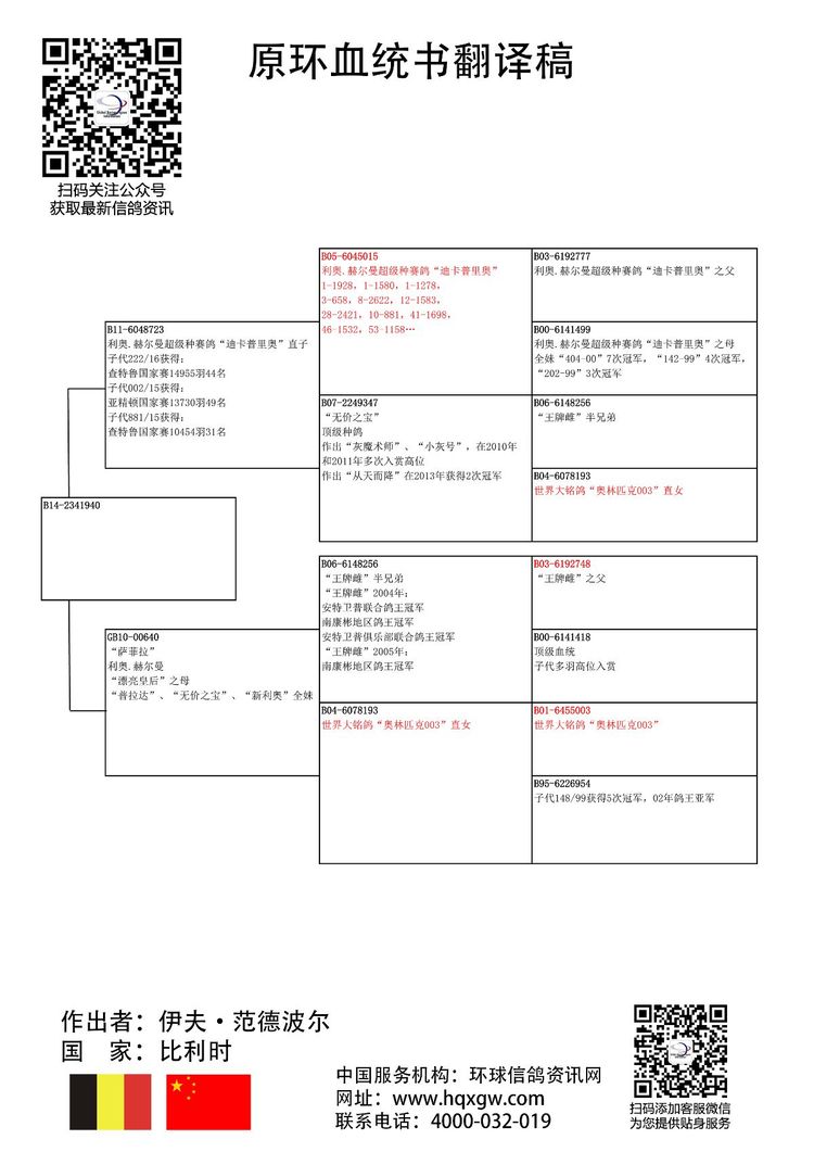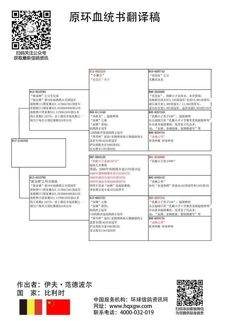 ![]() 伊夫·范德波尔与波品纳国家赛冠军 本次活动由环球信鸽资讯网发起,联合博冠三飞系刘西明先生,以定价形式出售【比利时超级明星-伊夫·范德波尔】5羽血统鸽。1月29号20:00(下周二)直播开卖,敬请期待! 手机:13281817363官方电话:4000-032-019微信:15208272070 伊夫·范德波尔,来自于比利时中部的布拉邦省海特贝茨市,伊夫十几岁开始比赛,在欧洲的中/长/超远程距离的赛事中,都取得非凡的成绩!累计取得了1500个以上的成绩。 主血有奶酪小子、奥林匹克003、吉林克斯、盖比等。 最近几年主要成绩: 4年获得3次国家赛冠军,高位不计其数。 查特鲁成鸽冠军·波品纳国家赛冠军·特鲁IV国家赛冠军等多个头衔囊入怀中。 2014年查特路国家赛全国成鸽4405羽冠军 2014年波治国家赛22663羽季军 2014年查特路国家赛全国成鸽4405羽冠军 2016年4205羽波品纳国家赛冠军 2016年波品纳国际赛12698羽季军 2017年查特鲁IV国家赛冠军 2018年利蒙治国家赛15783羽五名 本次【超级明星系列】的5羽赛鸽, 1号鸽血统:100%吉林克斯 ![]() ![]() 2号鸽血统:利奥·赫尔曼 ![]() ![]() 3号鸽血统:利奥·赫尔曼 ![]() ![]() 4号鸽血统:吉林克斯(国家赛冠军直子) ![]() ![]() 5号鸽血统:奶酪 ![]() ![]() 联系方式:13281817363 4000-032-019 微 信: 15208272070 ![]() |