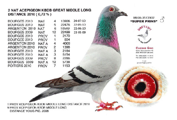![]() ![]() 超级王子,环号:B08-3172902,是比利时名家吉诺·克里克的铭鸽,本身获得2010年KBDB中长距离鸽王亚军,血统是75%芮娜系“戈恩”×25%凡代克系“所向无敌”。 名鸽介绍 谈到“超级王子”(Super Prince),吉诺先生言语中就充满了骄傲之情,他说这羽鸽子是他养鸽40年中最优秀的一羽赛鸽。“超级王子”在两年的大型国家赛中获得了3次特别好的成绩,它在幼鸽时就获得了国家赛的第12名,1岁时就获得过国家赛的第4名和第5名。并且这样的国家赛参赛羽数都超过了2万羽。 当记者问吉诺先生:“听说曾有鸽友出价15万欧元要买‘超级王子’,您为什么没有卖呢?”吉诺回答说:“今年有鸽友出价22万欧元我也没有卖,其实即使出再高的价钱我也不会卖的。‘超级王子’是我一生中不可多得的一羽好鸽子,我每天走进鸽舍,只要看到它健康快乐的成长,就是我最大的快乐,况且我现在也并不缺钱。虽说我不出售‘超级王子’,但是我可以把它的子代和孙代散播到世界各地,让所有爱好赛鸽的鸽友和我一起分享‘超级王子’带来的快乐!” “超级王子”信息 环号:B08-3172902 性别:雄 2010年KBDB中长距离鸽王亚军 波治国家赛22476羽5名 波治国家赛10906羽4名 亚精顿国家赛10549羽6名 波治赛国家赛22499羽12名 普瓦捷省赛1153羽7名 波治省赛2160羽1名 父亲环号为B07-3182013,“王子”之子。祖父环号为B97-3221726,是芮娜鸽舍的“戈恩”;祖母环号为B00-3124016,芮娜鸽舍顶级种雌。 母亲环号为B07-3182016,“飞戈”孙女。外祖父环号为B05-5201215,保罗.赫兹作;外祖母“琳达”环号为B04-3099057,“飞戈”之女。 名鸽赛绩 本身成绩: 2010年KBDB中长距离鸽王亚军 波治国家赛22476羽5名 波治国家赛10906羽4名 亚精顿国家赛10549羽6名 波治赛国家赛22499羽12名 普瓦捷省赛1153羽7名 波治省赛2160羽1名 直孙“黄金王子”,获2014年KBDB全国长距离一岁鸽组鸽王冠军,图勒全国赛5731羽4名,布瑞福全国赛3850羽3名,利蒙治全国赛6907羽14名。 ![]() 天津稳赢信鸽文化回馈鸽友(三) |