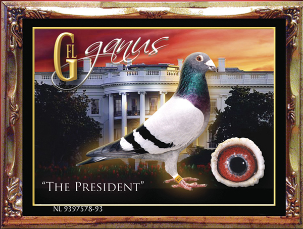 ![]() ![]() 世界铭鸽“总统号”(the President)NL93-9397578,世界最伟大超级种赛鸽之一。其中等体型,一字尾,短臂膀,羽毛柔软,老虎眼,眼睛非常有神,色彩非常鲜艳。据最保守估计,“总统号”的后代所获奖金远超35万美元! 名鸽介绍 世界铭鸽“总统号”(the President)NL93-9397578,世界最伟大超级种赛鸽之一。甘纳斯说:“总统号”是引进美国的最伟大赛鸽之一,它的价值超过百万美元! 1995年荷兰NPO国家赛短距离全国鸽王冠军 1995年荷兰Vredesduif全国鸽王冠军 一个赛季4次不同比赛,分别获得: 26000羽最高分速!30000羽最高分速! 30000羽最高分速!40000羽最高分速! 其他成绩(无重复纪录): 2045羽冠军、2074羽冠军、2086羽冠军、1867羽冠军 1804羽季军、1064羽季军、492羽冠军 1581羽8位、1463羽8位、4107羽13位 作为世界最伟大的超级赛鸽之一,“总统号”创造了几乎是史无前例的辉煌赛绩! 作为世界最伟大的超级种鸽之一,“总统号”作出的40多羽基础种鸽在比利时、荷兰、美国、中国等4个国家超级发挥,所获冠军、高位入赏不计其数!如: 女儿GFL 416-97作出 2000年美国雪鸟杯大奖赛冠军(奖金35000 美元) 儿子GFL 303-99作出 2000年美国赛鸽协会中西部年会大奖赛冠军(奖金10000美元) 儿子GFL165-98 作出 2000年美国拉斯维加斯百万美金公棚大奖赛殿军,并列冠军(奖金 33000美元) 7个500英里冠军…… …… 以上赛绩,只是“总统号”后代九牛一毛的成绩! “总统号”中体型,一字尾,短臂膀,羽毛柔软,老虎眼,眼睛非常有神,色彩非常鲜艳。据最保守估计,“总统号”的后代所获奖金远超35万美元! 此外,“总统号”的胞妹“安可”,也是一羽世界级的超级种母,子代和孙代中不下30羽赢得几千羽赛事的冠军,包括荷兰全国短距离 NPO 鸽王,奥尔良国家赛冠军,荷兰全国中距离 WHZB 鸽王3位,荷兰短距离国家鸽王3位等等。在中国,“安可”的孙代多羽获得万羽和数万羽大赛高位奖赏! 这真是一个伟大的世界鸽王冠军家族!!!能够拥有一羽这个家族的超级鸽子,将会给鸽舍带来不可估量的重大影响! 名鸽赛绩 1995年荷兰NPO国家赛短距离全国鸽王冠军 1995年荷兰Vredesduif全国鸽王冠军 一个赛季4次不同比赛,分别获得: 26000羽最高分速!30000羽最高分速! 30000羽最高分速!40000羽最高分速! 其他成绩(无重复纪录): 2045羽冠军、2074羽冠军、2086羽冠军、1867羽冠军 1804羽季军、1064羽季军、492羽冠军 1581羽8位、1463羽8位、4107羽13位 ![]() |