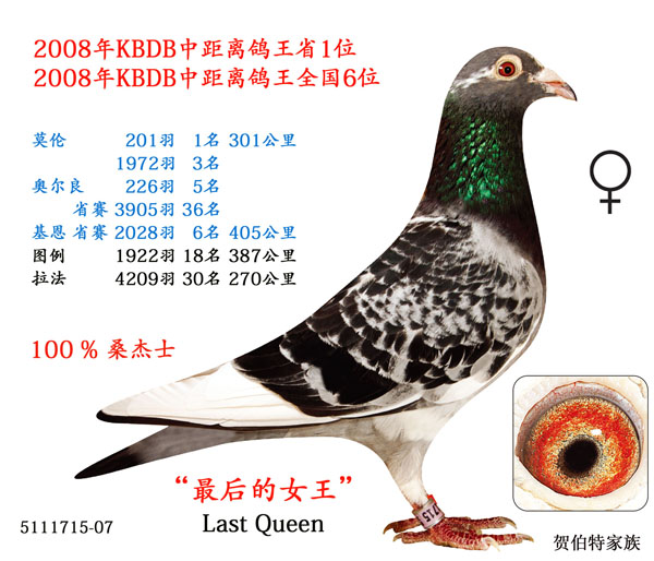 ![]() ![]() 最后的女王,环号B07-5111715,贺伯特家族大名鸽,百分百桑杰士血统,本身获的2008年KBDB中距离鸽王省1名,2008年KBDB中距离鸽王全国6名 。 名鸽介绍 最后的女王,环号B07-5111715,贺伯特家族大名鸽,百分百桑杰士血统,本身获的2008年KBDB中距离鸽王省1名,2008年KBDB中距离鸽王全国6名。 名鸽赛绩 2008年KBDB中距离鸽王省 1名 2008年KBDB中距离鸽王全国 6名 莫伦赛 201羽 301公里 1名 1972羽 3名 奥尔良赛 226羽 5名 省 3905羽 36名 基恩赛 省 2028羽 405公里 6名 图例赛 1922羽 387公里 18名 拉法特赛 4209羽 270公里 30名 其他资料 本身赛绩: 2008年KBDB中距离鸽王省 1名 2008年KBDB中距离鸽王全国 6名 莫伦赛 201羽 301公里 1名 1972羽 3名 奥尔良赛 226羽 5名 省 3905羽 36名 基恩赛 省 2028羽 405公里 6名 图例赛 1922羽 387公里 18名 拉法特赛 4209羽 270公里 30名 父:B06-5100530 “查特鲁号”之孙 桑杰士 -罗森·波斯 KBDB鸽王全国 6位之父 祖父:B02-5065145 其父“查特鲁号”获得: 查特鲁省赛 1名 “泰山”“闪电号”之兄弟 祖母:B01-5026771“电脑一号” 奥尔良 3名 /省赛 26名 莫伦 4名 /省赛 15名 桑杰士 母:B98-5200353 “皇后”系列 桑杰士品系 “王子”“巴隆”...之母 7次 1名之女 外祖父:B92-5041936 灰“优秀灰” “电脑二号”系列 获得 7次冠军 桑杰士 外祖母:B96-5089408 “电脑二号”之孙女 罗森·波斯 桑杰士 “皇后”之母 ![]() 鸽界教主盖比核心血统网络拍卖(三) |