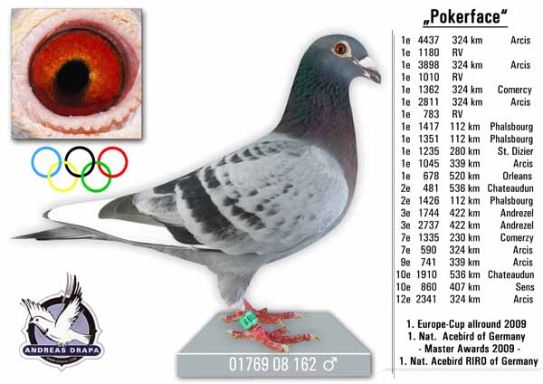 ![]() ![]() “扑克脸”,DV01769-08-162,斑白羽,德拉帕新生代传奇雄鸽,顶级奥林匹克大将,传奇“冠军号”的直子! 名鸽介绍 DV01769-08-162 “扑克脸”,斑白羽,德拉帕新生代传奇雄鸽,顶级奥林匹克大将,传奇“冠军号”的直子! 荣获: 2011年奥林匹克全能鸽王德国冠军 2011年波兹南奥林匹克全能鸽王国际亚军 2009年欧洲杯全能冠军 2009年德国RIRO全国鸽王冠军 名鸽赛绩 “扑克脸”荣获: 2011年奥林匹克全能鸽王德国冠军 2011年波兹南奥林匹克全能鸽王国际亚军 2009年欧洲杯全能冠军 2009年德国RIRO全国鸽王冠军 4437羽冠军(324公里) 3898羽冠军(324公里) 2811羽冠军(324公里) 1362羽冠军(233公里) 1417羽冠军(110公里) 1351羽冠军(110公里) 1235羽冠军(280公里) 1045羽冠军(339公里) 678羽冠军(520公里) 1426羽亚军(112公里) 481羽亚军(536公里) 2737羽季军(422公里) 1744羽季军(422公里) -“扑克脸”的优秀半兄弟姐妹代表及佳绩: 1.“潘妮洛普”: 2011年波兹南奥林匹克全能鸽王国际季军- 铜牌得主 2011年奥林匹克全能鸽王德国亚军 2010年欧洲杯全能鸽王季军 地区雌鸽鸽王冠军 RIRO雌鸽鸽王冠军 19次打入前十位!近两年来世界最快赛鸽之一! 具体佳绩: 安德雷泽1744羽冠军 法尔斯堡1426羽冠军 法尔斯堡1417羽冠军 克莫西1335羽冠军 安德雷泽886羽冠军 阿西斯4437羽亚军 克莫西2786羽亚军 安德雷泽2737羽亚军 阿西斯1180羽亚军 克莫西1362羽亚军 圣迪西尔1235羽亚军 赛佛恩951羽亚军 奥尔良678羽亚军 阿西斯3898羽季军 阿西斯2811羽5位 阿西斯1045羽5位 查特顿481羽5位 阿西斯741羽7位 圣迪西尔547羽7位 查特顿1910羽15位 圣斯860羽15位 阿西斯590羽15位 阿西斯1189羽17位 圣迪西尔916羽25位 阿西斯3557羽33位 阿西斯2341羽33位 ![]() 天津稳赢信鸽文化优秀种鸽(一) |