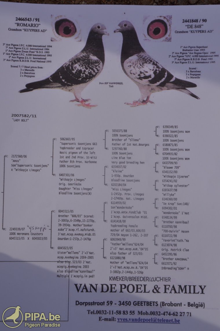 | 2013年我们在成都鸽展有幸与伊夫相识并与他合作,成功在环球信鸽网举办了两场专场网络拍卖。 2014年伊夫·范德布获得了查特鲁Ⅱ成鸽组冠军,其后,我们与伊夫长期保持着联系。 在刚刚结束的波品纳国际赛又取得了比利时国家冠军,国际组3名的好成绩。 伊夫·范德布的“博尔特小姐”(Lady Bolt BE11-2007582)2014年获得了查特鲁Ⅱ成鸽组4316羽冠军,其飞行空距为517.216km,平均分速达到1603.77米/分。 ![]() “博尔特小姐”(Lady Bolt BE11-2007582) 毫无疑问“博尔特女郎”为一羽顶级赛鸽。她在2013年的表现同样优异, 7场全国赛全部入赏顶级名次。 蒙吕松 (582 Km) 18568羽 166 亚精顿 (546 Km) 16325羽 531 波治 (466 Km) 9639羽 132 查特路 (516 Km) 4757羽 49 亚精顿 (546 Km) 5941羽 35 伊苏丹 (456 Km) 5670羽 30 拉索特年 (581 Km) 4144羽 119 由于以上的这些佳绩,2013年她获得了多项鸽王头衔。 ![]() “博尔特小姐”(Lady Bolt BE11-2007582)血统书 从她的血统书可以看到父系含有75%的桑杰士血统,她的祖父“超音速桑杰士663号”( Supersonic Soontjens 663 BE95-5062663)来自比利时吕门(Lummen)的托尼.马顿斯(Tony Martens),他不仅是一羽超级赛鸽,而且他的育种能力更加出色。“博尔特女郎”的母系为100%贺尔曼-裘斯特血统。可见这羽赛鸽的血统相当优秀。 波品纳国际赛比利时冠军,国际组3名。 在刚刚结束的波品纳国际赛,“波品纳小姐”( Miss Perpignan)完成了伊夫.范德布一生的梦想:赢得一场超长距离国际赛冠军。这是他在成功的职业生涯中获得的当之无愧超长距离比赛的胜利。 ![]() 伊夫·范德布 波品纳比赛是大部分超长距离鸽友认为的仅次于巴塞罗那比赛的最有声望的国际赛事。这场国际超长距离竞赛的收官之战是成功但艰难的经典之作。 本赛季的天气情况相当不错。鸽子在周五早上放飞,天气晴朗,中午的时候从北部到法国天空都非常清澈。波品纳是一场公平的比赛,没有太多困难。许多顶尖成绩在放飞的当天已经产生。 伊夫.范德布,运动场上的大牌赛手 伊夫.范德布的名字多年来一直与巴塞罗那比赛密切相关。这是他至今为止最喜欢的一场比赛,并且在那里已经取得了一些优异的成绩。但是伊夫一直在寻找新的目标,他决定参加大中距离及长距离比赛,并且在2014年获得了查特路全国成鸽组冠军。如今又为他的成绩榜单添上了一项著名的全国冠军奖项,获得了本赛季最后一场超长距离比赛,波品纳经典赛冠军。 伊夫总是对超长距离比赛充满激情。他已经在比赛中获得了一些优异的成绩,但是还没有赢得过最高级别的冠军。他在1995年获得了KBDB全国超长距离最佳鸽舍冠军的头衔。 伊夫终于于2016年7月29日完成了他的目标,赢得了波品纳冠军。他的冠军鸽是一羽鳏夫雌,她是一羽相当有天赋的赛鸽。“波品纳小姐”的打钟时间为20:00'20",总飞行空距935.038公里,以1221.74米/分的速度成为比利时速度最快鸽。 ![]() ![]() ![]() -“波品纳小姐”(Miss Perpignan BE13-2176063) 16年波品纳全国 4205羽 冠军 16年波品纳国际 12698羽 季军 15年图勒全国 6229羽 34位 16年马赛全省 215羽 4位 16年马赛全国 2166羽 59位 16年莱邦纳全国C赛区 2552羽 191位 15年贝吉拉克联省 627羽 13位 在“波品纳小姐”的血统里有个有趣的故事:最初,这羽雌鸽是被用于中长距离比赛,那是因为她的父亲是一羽出自范诺本-路耶腾鸽舍的雄鸽,并且在他的血统中有多羽中距离冠军。这就意味着她将是中长距离队伍中的一员。然而,去年她却多次进入长距离队伍参赛。考虑到她的血统,伊夫不太确定他是否能应付更长距离的赛事。最终,他决定用她上笼参加贝吉拉克比赛,而“波品纳小姐”在这场比赛中发挥出色。激励成为关键。 今年同样的事情又发生了,她的身体素质在七月获得明显改善。她在波品纳冠军之前已经获得了多次莱邦纳及马赛高位入赏。她真是一羽非常强劲的优秀雌赛将! 这是她的血统: 父亲:“灰白羽雄”(Blauwwitpen Vanoppen-Luyten BE10-5176215),范诺本-路耶腾原环 “小比诺”( Little Pino BE08-5187083,“新皮诺丘”回血)x“克拉斯雌068号”(Klaasje 068 BE08-5187068,半姐妹“克拉斯雌”获得:查特路4757羽14位,吉恩7916羽24位,波治8003羽29位,波治全国22663羽137位,伊苏顿5670羽31位,蒙吕松1932羽10位等…)直子。这是范诺本-路耶腾的顶尖品系。 母亲:“塔碧斯号直女”(Daughter Tarbes BE10-2217026) 她来自凡佛伦.伊万(Ivan Vanvuchelen)血统。她出自一羽超级雌鸽“塔碧斯号”( Den Tarbes BE04-2138015,塔碧斯全省冠军及全国4660羽季军,布洛瓦全省1350羽冠军,查特路995羽冠军,图瑞325羽冠军,贾纳克半国家5005羽59位)x“灰鲁腾”( Blauw Rutten BE07-2201117,出自摩利斯.鲁腾)。她荣获波品纳全省冠军及贾纳克全省冠军,是一羽100%阿布瑞奇的血统鸽。 ![]() “波品纳小姐”血统书 ![]() “波品纳小姐”中文血统书 伊夫上笼了2羽赛鸽参加波品纳比赛,并且他们都获得了高位入赏。他还没有获得过巴塞罗那比赛的全国冠军,仍然希望有一天能得偿所愿。但是获得本次第二个最有声望的经典超长距离比赛冠军仍是非常骄傲的。祝贺伊夫! |
