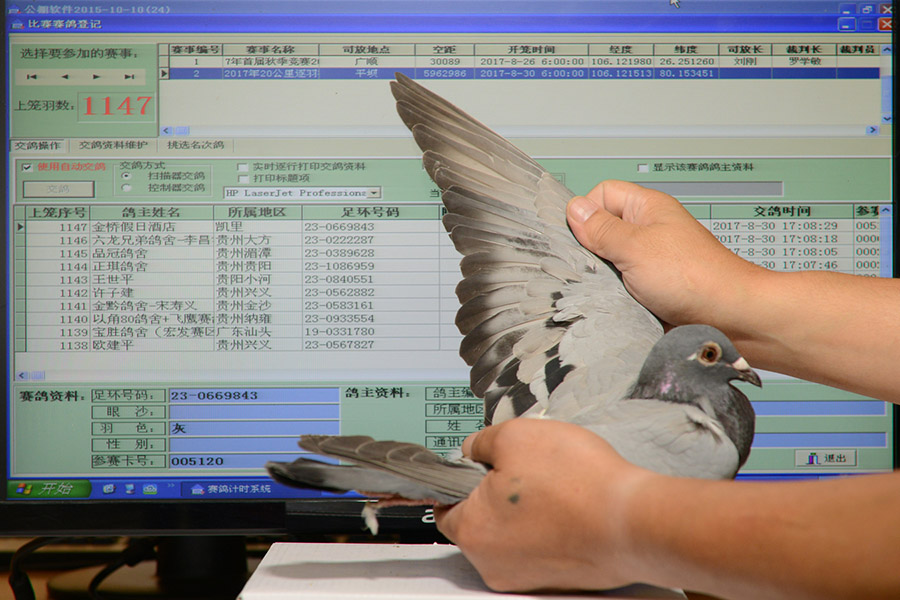 赛鸽足环号: 23-0669843 次序:2661 赛鸽特征:灰 清棚时刻:2017-8-30 17:08:29