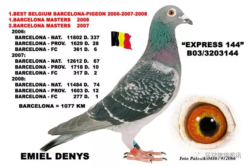 这只是艾米尔.丹尼斯近两年的高光时刻,而被誉为“比利时鸽王”,其成绩可谓显赫,曾至少22次获得国内外大赛冠军: 1969年圣维仙国家赛冠军 1970年卡奥尔国家赛冠军 1974年拿邦国家赛冠军 1974年圣维仙国家赛雌鸽组冠军 1981年利蒙治国家赛雌鸽组一岁鸽冠军 1982年利蒙治德比国家赛雌鸽组冠军 1983年波品那国际赛雌鸽组冠军 1984年派利魁国家赛冠军 1985年利蒙治国家赛一岁鸽雌鸽冠军 1986年利蒙治德比国家赛雌鸽组冠军 1996年利蒙治国家赛冠军 1996年利蒙治国家赛冠军 2002年圣巴斯帝安国际赛冠军 2002年圣巴斯帝安国际赛雌鸽组冠军 2002年圣巴斯帝安国家赛冠军 2003年圣维仙国家赛A区冠军 2003年圣巴斯帝安国际赛雌鸽组冠军 2005年西班牙加泰罗尼亚FCI冠军 2008年匈牙利FCI冠军 2008年圣维仙国际赛雌鸽组冠军 2008年中国长春天宇公棚冠军 2011FCI锦标赛泰国浓开520公里亚军暨“公主杯冠军” 1998年,在艾米尔.丹尼斯(Emiel Denys)和朱利安.凡尼诺(Julien Vaneenoo)的倡议下组办而成的巴塞罗那精英赛,目前已发展成为巴塞罗那国际赛指定赛的代表。 百年养鸽传承