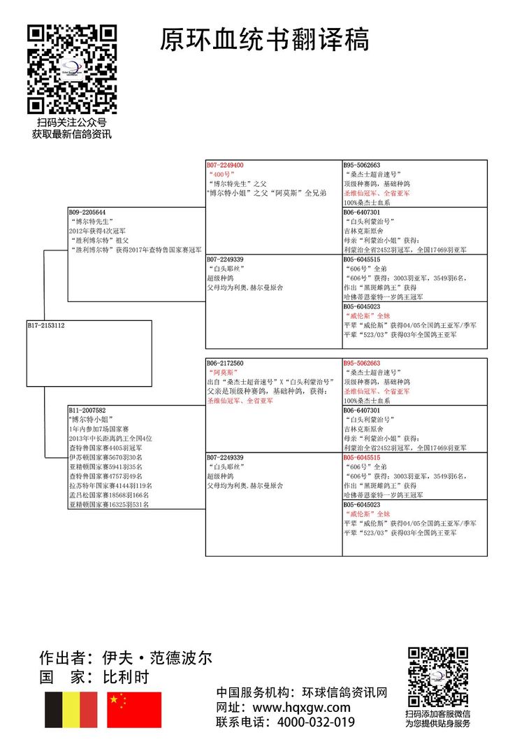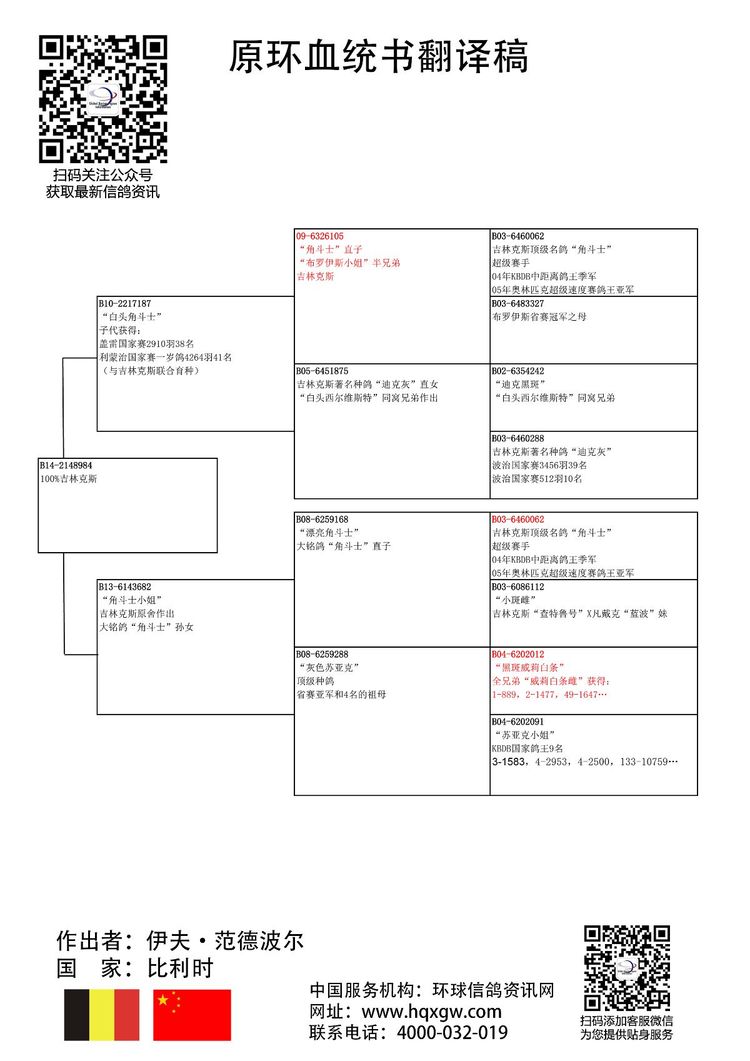 ![]() 伊夫·范德波尔与波品纳国家赛冠军 本次活动由环球信鸽资讯网发起,联合博冠三飞系刘西明先生,以定价形式出售【比利时超级明星-伊夫·范德波尔】5羽血统鸽。1月29号20:00(下周二)直播开卖,敬请期待! 手机:13281817363官方电话:4000-032-019微信:15208272070 伊夫·范德波尔,来自于比利时中部的布拉邦省海特贝茨市,伊夫十几岁开始比赛,在欧洲的中/长/超远程距离的赛事中,都取得非凡的成绩!累计取得了1500个以上的成绩。 主血有奶酪小子、奥林匹克003、吉林克斯、盖比等。 最近几年主要成绩: 4年获得3次国家赛冠军,高位不计其数。 查特鲁成鸽冠军·波品纳国家赛冠军·特鲁IV国家赛冠军等多个头衔囊入怀中。 2014年查特路国家赛全国成鸽4405羽冠军 2014年波治国家赛22663羽季军 2014年查特路国家赛全国成鸽4405羽冠军 2016年4205羽波品纳国家赛冠军 2016年波品纳国际赛12698羽季军 2017年查特鲁IV国家赛冠军 2018年利蒙治国家赛15783羽五名 本次【超级明星系列】的5羽赛鸽, 1号鸽血统:100%吉林克斯 ![]() ![]() 2号鸽血统:利奥·赫尔曼 ![]() ![]() 3号鸽血统:利奥·赫尔曼 ![]() ![]() 4号鸽血统:吉林克斯(国家赛冠军直子) ![]() ![]() 5号鸽血统:奶酪 ![]() ![]() 联系方式:13281817363 4000-032-019 微 信: 15208272070 ![]() |