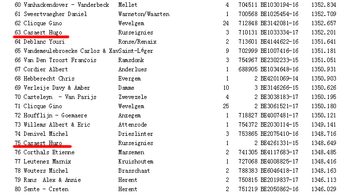 翻看刚刚结束的比利时卡奥尔国家赛(参赛羽数:6898羽)的成绩单,一个既熟悉又陌生的名字进入视线:63名,75名,Casaert Hugo!是不是眼熟,Casaert,卡萨特;是不是陌生,雨果.卡萨特!
