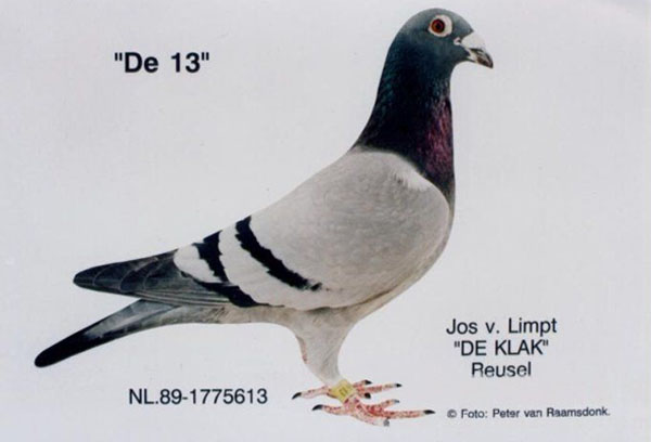 ![]() ![]() 名鸽介绍 “斗士613”是克拉克一生中最伟大的赛鸽。“斗士613”是一羽黄眼灰雄,其外表长得并不好看,个头又大了一些,而且又有点僵硬感,但它每次出赛都能都能上位入赏。“斗士613”有着惊人的定向能力,但它也有一个坏毛病:就是归巢后,不喜欢马上进到鸽舍,要不然,要不然它的赛绩还会更加的惊人。 名鸽赛绩 在1990年以当岁鸽身份参赛时,获得5次冠军,其中有3次的比赛都有上千羽参加,也夺得了1990年省(ZNB)中距离的鸽王宝座,而且还获得3次鲁塞尔鸽王的第一位。 布拉班东区中距离鸽王一位、一位、二位、六位。 荷兰Z.N.B中距离鸽王一位 查特鲁320公里一位 1162羽 克雷尔330公里一位 340羽 查特鲁320公里一位 506羽 奥尔良450公里二位 451羽 查特鲁320公里二位 967羽 查特鲁320公里二位 1270羽 奥尔良450公里三位 382羽 查特鲁320公里三位 513羽 查特鲁320公里四位 1230羽 圣盖斯兰145公里4位1416羽 “斗士613”的(100%纯种克拉克)后代们的顶级赛绩的范例: NL98-9885826 第一名 7971羽 600km 2002年伯格曼兄弟作翔 NL99-5939621 第二名 9956羽 620km NL99-5939621 第十三名8631羽 510km 2002年凡..比克作翔 NL00-5035028 第一名 26358羽 245km 凡..比克作翔 NL03-5326643 第一名 36550羽 2002年凡..比克作翔 NL00-1161906 第一名 6886羽 NL00-1161906 第一名 2953羽 迪克.波斯曼 NL01-0174649 第一名 13110羽 451km 2002年伯格曼兄弟作翔 NL02-0267486 第一名 4927羽 430km 2002年吉伯尔作翔 NL03-4115798 第一名 5943羽 451km 2003瑞.奥斯作翔。 其他资料 “斗士613”父亲克努克(De Knook)NL87-2542927是克拉克作育出的一羽黄眼灰雄。因为它确实长的太难看,不仅头大而且有些僵硬感,所以才取名为克努克(克努克在荷兰语里的意思是难看的、丑的意思)克拉克本人也不喜欢难看的鸽子,就把克努克和另外10羽鸽子拿出来要出售,其他的10羽幼鸽很快就被买走,看来谁也不喜欢难看的鸽子,这羽克努克,因此就没有鸽友想要。无奈的克拉克只好把克努克放进赛鸽舍里让它去参赛。“虽然我很丑,但是我很争气!”当一岁鸽时(1988年)克努克就获得了12次奖;次年又再次获得了13次奖。这样一个偶然的机遇使得克努克摇身一变,成为只需育种而不再参赛的种鸽。 “斗士613”母亲:克拉克的一羽极心爱的雌鸽85母NL88-8810985,幼鸽时曾获得4940羽的冠军。85母的原配雄鸽在1989年赛绩里遗失了,85母一下次成了年轻的单身雌鸽,这种情况一般来说是很容易迷失的。因此克拉克感到事不宜迟,应该马上给找到一羽雄鸽给配上以防万一。克拉克当时异想天开地把谁都不要的克努克陪给了谁看都想要的85母。之所以这样,一半可能是怕自己心爱的85母给迷失了,而另一半则是出于好奇心所使吧。以外表最好看的和最难看的相配,看看到底会出什么样的鸽子来。于是乎,“斗士613”横空出世了,克努克也就成为了种鸽舍中的宝贝。 ![]() 第16期 查特鲁Ⅱ国家赛成鸽组冠军格雷芬.倚天.杰优秀种鸽名血拍卖 |