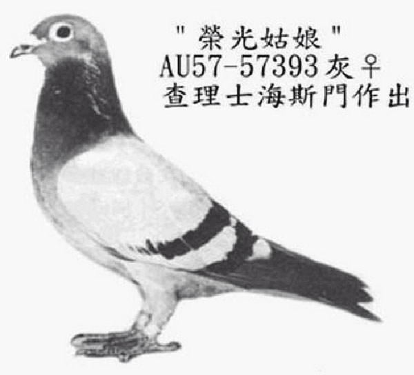 ![]() ![]() 名鸽介绍 荣光姑娘号的母鸽是AU-55-KY-55058号灰色斑点母鸽,未曾参加比赛。但55058号的母亲是曾经获得二次全美五百英里冠军的世界铭鸽“海纯号”灰斑母鸽,而它的父亲AU-5O-KY-50527号已有三代连续五百英里冠军的记录。因此,荣光姑娘号赛是集精华于一身。 名鸽赛绩 荣光姑娘号AU-57-KY-57393号母鸽,也是幼鸽时,曾经飞过50、75、117英里。“荣光姑娘号”的父亲AU-48-OKY-4是海斯门鸽舍最高贵的种鸽,曾参加500公里及800公里赛,其后代获大奖不计其数,其父鸽AU-40-KY-40016号灰公,也是一羽杰出的赛鸽,曾经得到过两次五百英里赛冠军以及五百英里当日归返的纪录,也曾经获得金质奖章。 其他资料 数十年来,其后代毫无间断,一直在台湾各地发挥灿烂之成绩,受到众多鸽迷之喜爱。所以它获有五个号称。 第一个:“光明希望”,是郑金城先生对它有很大希望而命名。 第二个:“海斯曼西翁”,是郑金城先生过去养有日据时代留存之“并河西翁”(3546)同属于此系,金子西翁(66326)属于此系,还有远藤西翁、阿布西翁、永代西翁等几种。光明希望一进口就以雷响之声势而受到各方所瞩目,因为它是由海斯曼鸽舍购进的,所以就有人叫它“海斯曼西翁”。 第三个:“第一批西翁”,郑金城先生向海斯曼鸽舍购近将近有十批西翁鸽,此鸽属第一批鸽,所以就另有人称它为“第一批西翁”。 第四个:“四号西翁”,此鸽最初之配偶是原配对鸽“荣光姑娘”。“荣光姑娘”是海斯曼鸽舍名生产鸽48-OKY-4灰公之女。因此它作出之后带有4号之血统在发挥,大家又称为“四号西翁”。荣光姑娘夭折后另选“贵夫人”61-61011交配,其后代发挥并不亚于交配“荣光姑娘”之成绩,但仍然叫它为“四号西翁”。后来不知不觉之中“光明希望”又被称“四号仔”。 第五个:“光明仔”,光明希望因为太受欢迎,到处都喊有它有声音。光明希望四个字太长一点,所以大家省略后就叫“光明仔”,一只鸽子会有五个称呼也是很罕见。 ![]() 第16期 查特鲁Ⅱ国家赛成鸽组冠军格雷芬.倚天.杰优秀种鸽名血拍卖 |