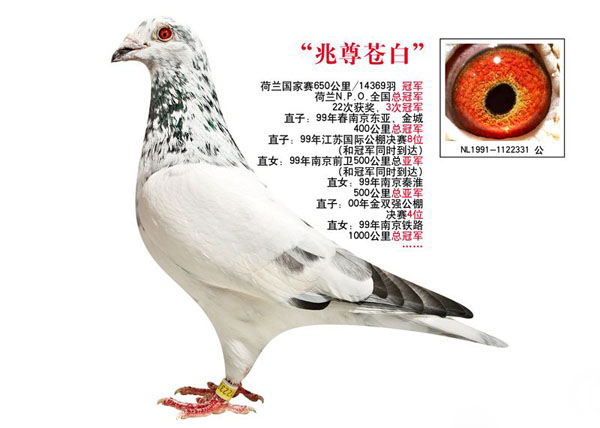 ![]() 兆尊苍白(NL1991-1122331),又名苍白骑士,是由荷兰赛鸽隐士乔.戴穆伦作翔,荷兰NPO全国冠军,22次获奖,3次冠军。二零一零年三月五日上午六时十八分善终于上海兆尊馆,享年十九岁。 名鸽介绍 兆尊苍白原名苍白骑士,这个名称来源于该羽鸽子属于白鸽羽色,但又不完全为纯白,其尾翼后端都有一部分黑色,且在颈部有红色羽毛,背部也有淡淡的几点绛红色羽毛。 1996年由台湾鸽界名流何松轩先生将“苍白骑士”引进到中国,“苍白骑士”的名字应该是由何松轩先生起的。在同年,何先生作育了几羽子代,其中一羽97-091997(私环)获98年上海市500km市俱乐部冠军,97年6月何先生将三十多余鸽子作价转让于曹力前先生,苍白骑士作价16万也在其中,97年八月年兆尊馆重金收购了这批鸽子,胡维奇先生将“苍白骑士”引入兆尊馆后,立为“镇馆之宝”。后根据国际惯例,谁持有谁命名的原则,胡维奇先生将“苍白骑士”正式命名为“兆尊苍白”,成为该馆的重要成员之一。在我们南京鸽友当中知道兆尊馆的人很多,但是在全国范围内的广大鸽友当中,可能大多是由“兆尊苍白”而知道兆尊馆,认识到胡维奇...... 究其血统,“苍白骑士”的作出者是荷兰的J.J莫伦先生,他的这只花雄在当岁时就给主人带来的莫大的欣慰,荣获荷兰N.P.O.全国总冠军,22次获奖,3次冠军!但让人遗憾的是,J.J莫伦先生的这路花鸽血脉早在2002年时因黄鼠狼的数次光顾导致断系。J.J莫伦先生称“苍白骑士”的血统里含老贺尔曼血系血脉,另外获知J.J莫伦先生在他所属的赛区是一家仅有几十羽鸽子的迷你鸽舍,低调养鸽,低调做人,赛鸽仅是他的一个业余爱好而已,而“苍白骑士”也是他唯一出售的一只。 名鸽赛绩 “苍白骑士”NL91-1122331白麒麟花黄眼雄鸽,本身获荷兰国家赛14369羽650公里冠军,NPO全国冠军,22次获奖,其中3次冠军作为种鸽。 1997年南京兆尊馆胡维奇先生引进“苍白骑士”后,胡维奇与当下教练陈华反复思量比较后配了两羽种雌,一羽是比利时艾立克.林伯格的“女王号”B95-2363131灰花黄眼雌鸽;另一羽种雌是比利时万侯家的“滚桶小姐”B96-6086064雨点黄眼雌鸽,从此拉开赛鸽场上无可比拟的辉煌序幕! ★“苍白骑士”配“滚桶小姐”直接作出“兆尊小苍白”98-10-538799白麒麟花黄眼雄鸽,获2000年南京500公里5550羽第22名;2002年6月获南京中山俱乐部500公里990羽冠军、大奖赛总冠军; “兆尊小苍白”直接作出“兆尊宝马”03-09-019855喷点灰黄眼雄鸽,获2004年春上海市500公大奖赛总冠军,共参赛48488羽,闵行区冠军,全兄妹获2004年春上海市500公里大奖赛22名(48188羽),2004年春上海赛鸽俱乐部600公里第6名,2003年秋获上海市赛鸽俱乐部排名赛冠军。 苍白骑士5代鸽04-09-244701黄眼雌鸽,获2005年上海赛鸽俱乐部春季500公里比赛冠军。胡维奇先生用★“苍白骑士”配“女王号”作出“梦幻145”98-10-539145麒麟花黄眼雌鸽,两次获500公里比赛总亚军。 “梦幻145”直子99-10-077594黄眼雄鸽,获1999年南京中山俱乐部550公里1528羽大奖赛总冠军;直女03-09-213597麒麟花黄眼雌鸽,获2003秋季上海450公里第二届“希望杯”大奖赛4名…… 至今“苍白骑士”的后代发挥至六代! ![]() |