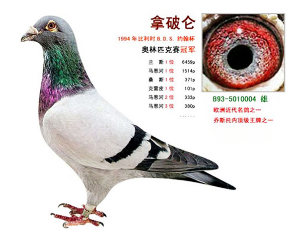 ![]() 拿破仑,B93-5010004,雄。父亲:B89-5176169,杨龚多拉斯“好的一岁鸽”多重近亲。祖父:B85-5136124,父亲为杨龚多拉斯“好的一岁鸽”同父兄弟。祖母:B82-5315340,杰出种母,“奥尔良2号”和“好的一岁鸽”直女。母亲:B91-5110266,顶级种鸽。外祖父:B87-5168753“不可能号”,“奥尔良2号”和“好的一岁鸽”直系。外祖母:B86-5227631,“王牌”之母。 名鸽介绍 数年前阳光家园吴一坚先生亲赴比利时引进种鸽,当时乔斯托内正日照中天,连获巴塞罗那国际、国内冠军六次,全国冠军、省赛冠军多项,在短、中、远程中尽显霸主威风。二人相见,惺惺相惜,吴总出巨资一次引进了乔斯托内各级别冠军、大名鸽数十羽。此后,二位人杰来往日渐亲密,从买家、卖家,转为知己鸽友。乔斯托内多次受约亲赴阳光家园交流赛鸽饲养、制种技术,并深深为吴一坚先生爱鸽的真情所打动,毅然将名震世界鸽坛的大名鸽“拿破仑”赠送给了阳光家园,以示友情。 “拿破仑”杰出有三: 1. 集世界名系杨龚多拉斯极致名血于一身,集欧洲近交育种顶级手法于一身 2. 本身赛绩卓著,1994年比利时奥林匹克全国冠军,6459羽冠军,1514羽冠军…… 3. 儿女子孙后代获奖无数 乔斯托内以“拿破仑”配超人,配博格,接连数十代夺得比利时及国际大奖,并连年被比利时鸽会及欧洲鸽报评选为最佳种赛鸽手,最佳赛鸽家。“拿破仑”居功至伟。 仅以世界最著名的油人鸽舍,盖斯•比达斯为例,这一世界公认的赛鸽高人,千挑万选后引进了一羽“拿破仑”直女“诺斯”,直接作出世界名鸽“悍将”。“悍将”夺九次冠军,其中包括四万羽冠军,22次夺得前三名,58次获得前奖;“悍将”出子孙代冠军超过百羽,其中三羽直子获荷兰NPO全国冠军,四羽直孙又获全国冠军。“悍将”作为“拿破仑”的杰出外孙,以一条支流的澎湃,反应了“拿破仑”种群汪洋大海般的壮阔。 名鸽赛绩 1994年比利时BDS约翰杯奥林匹克赛全国冠军。 真正懂得乔斯托内鸽子的鸽友应该知道,乔斯托内在2004年以前血统比较清楚,可以大致分成4路鸽子。1、拿破仑组(中距离),2、超人组包括飞奴和丹麦人(中距离),3、漂亮巨人组(长距离),4、搏鸽组(超长距离)。后期血统较多。通过我们连续10年对乔斯·托内鸽子的大量买进,反复研究,终于发现奥秘所在。事实证明乔斯·托内的“拿破仑系”才是真正的杀手锏。配超人,又快又稳。经常夺冠,总有意外惊喜。包括2004年以后,虽乔斯·托内血统较多,但他基本上90%的中距离冠军鸽和他的超级种赛鸽都必有“拿破仑”的血统。在乔斯·托内的很多信鸽血统书中都可以看到“拿破仑”的名字。其中包括名震全国的“白雪公主”等一系列超高价位大铭鸽。 “拿破仑”及其直系被称为“黄金血统”,是乔斯·托内最得意的信鸽之一。当我们还在为究竟是选择讲究爆发力的速度鸽,还是耐力超强的长距离鸽而头疼不已的时候,“拿破仑系”用以往在短、中、长距离的比赛成绩,充分证明了“拿破仑系”正是目前这种赛线复杂,竞争激烈的比赛所最需要的赛鸽。 乔斯·托内用“拿破仑”配同属拿破仑血系的“依希斯”,作出一羽“奥林匹克金花”获得奥林匹克鸽王总冠军。“拿破仑”的女儿直接作出的雌鸽“茜拉”,获得了有万羽鸽子参加的1997年奥尔良比赛冠军。 “拿破仑”的一羽平辈姐妹“奈菲尔提帝”,获得波治国家赛雌鸽组冠军,而且战胜28706羽参赛鸽,勇获季军。它的一名女儿“尤拉”,赢得了利摩日省赛冠军…… “拿破仑系”儿女子孙后代持续发挥、获奖无数。实在无法把他的后代所得的成绩一一列举出来。这是一个杰出的血统,他拥有着最优秀的遗传基因。记得国际鸽坛一着名鸽友曾这样评价说‘“拿破仑”超强的育种能力是让人难以想象的,他非凡的卓越在于他不是“拿破仑”本身的发挥,而是“拿破仑”整个家族的发挥'。 并不是每羽冠军鸽都能称为超级种鸽,但“拿破仑”却能。真正的“拿破仑”总会有让人意想不到的恐怖成绩。我们可以从他的祖父母的血统中发现他们那一代最好的鸽子之一,即杨.龚多拉斯鸽系最着名的“好的一岁鸽”。世界鸽史早就把乔斯·托内称为杨.龚多拉斯鸽系最着名的“好的一岁鸽”的掌门人! 拿破仑家族品系特征:骨骼坚韧,肌肉柔软,气囊发达,羽色灰,少数灰白条,羽毛绸缎般光滑,砂眼,品味极高,性格稳健,大气,非常早熟,具有超强稳定的定向能力且具有纯血系鸽的所有优势。近亲作育是其品系特点。易融于其他品系,并保持原有品系长处。稳定性高,适应赛线广泛,是大赛及特比环和各地公棚赛首选种鸽,并胜任各类型鸽棚作为基础种鸽。其后代参赛表现稳定快速。刚开始养此品系鸽时经常有又让人意想不到的恐怖成绩,但时间长了赢得次数逐渐增多后,就会感觉到用此品系鸽比赛确实有一种说不出的优越感,取得好成绩已成自然。 可以说真正“拿破仑系”的鸽子是不挑天的,并且没有假状态,只要在中距离范围内(我国常指700公里之内),不论什么天气,他的定向都要相对的比其他的选手鸽准确一些!两点之间线段最短是最简单的定律。拿破仑的子孙后代会为喜欢它们的主人赢得无限的荣誉。不论是初出茅庐新手,还是纵横赛场的老将,一个个冠军接踵而来,拿破仑系的鸽子为许多鸽友不论从经济上还是精神都得到了充分的满足。这一切都归功于“拿破仑”那金子般的高贵血