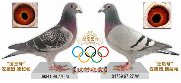 “皇室配对”(国王号X皇后号)是德拉帕舍内头号基础配对 此配对也是德国赛鸽史上最优秀配对之一 本场拍卖主要血统介绍 【“国王X王后”直系:B1】 “国王X王后”DV09341-98-770XDV01769-97-27:“皇室配对”DV09341-98-770XDV01769-97-27(国王号X王后号)是德拉帕舍内头号基础配对!他们也是德国赛鸽史上最优秀的配对之一!他们最优秀的直子代代表非“冠军号”和“卡尔”莫属: 1.“冠军号”: 2004年德国全国全能雄鸽鸽王冠军、2004年全国长距离雄鸽鸽王亚军、2004年全国中距离雄鸽鸽王季军、2005年波尔图奥林匹克全能鸽王国际10位 -“冠军号”本身也是3羽奥林匹克鸽王的父亲(冠军、亚军、季军) ~“冠军号”的优秀直子代代表及佳绩: ①“超级冠军雌”(“卡桑德拉”同窝姐妹): 2009年德国大师杯全国鸽王4位、2736羽冠军(225公里)、884羽亚军(285公里)、996羽季军(185公里)、4437羽5位(324公里)、2341羽5位(324公里)、1010羽6位(324公里)、1744羽6位(422公里)、2538羽8位(229公里)、1205羽8位(243公里)、3898羽9位(324公里)、3000羽10位(179公里)、 ②震撼级赛将“卡桑德拉”: 2009年欧洲杯全国中距离鸽王冠军、2011年波兹南奥林匹克中距离鸽王国际冠军- 金牌得主、世界最优秀的全能赛鸽、2011年波兹南奥林匹克中距离鸽王德国冠军、2009年欧洲杯中距离鸽王冠军、 2009年大师杯全国鸽王亚军、2737羽冠军(422公里)、2341羽冠军(324公里)、1189羽冠军(324公里) 1045羽冠军(339公里)、860羽冠军(407公里)、2811羽亚军(324公里)、1744羽亚军(422公里)、2538羽亚军(229公里)、1362羽季军(233公里)、4437羽4位(324公里) 481羽6位(536公里)、996羽7位(179公里) ③“扑克脸”: 2011年奥林匹克全能鸽王德国冠军、2011年波兹南奥林匹克全能鸽王国际亚军、2009年欧洲杯全能冠军、2009年德国RIRO全国鸽王冠军、4437羽冠军(324公里)、3898羽冠军(324公里)、2811羽冠军(324公里)、1362羽冠军(233公里)、1417羽冠军(110公里)、1351羽冠军(110公里)、1235羽冠军(280公里)、1045羽冠军(339公里)、678羽冠军(520公里)、1426羽亚军(112公里)、481羽亚军(536公里)、2737羽季军(422公里)、1744羽季军(422公里) ~“扑克脸”的直子“英雄”共计9次夺得冠军! ④“潘妮洛普”: 2011年波兹南奥林匹克全能鸽王国际季军- 铜牌得主、2011年奥林匹克全能鸽王德国亚军、2010年欧洲杯全能鸽王季军、地区雌鸽鸽王冠军、RIRO雌鸽鸽王冠军、19次打入前十位!近两年来世界最快赛鸽之一! 具体佳绩:安德雷泽1744羽冠军、法尔斯堡1426羽冠军、法尔斯堡1417羽冠军、克莫西1335羽冠军、安德雷泽886羽冠军、阿西斯4437羽亚军、克莫西2786羽亚军、安德雷泽2737羽亚军、阿西斯1180羽亚军、克莫西1362羽亚军、圣迪西尔1235羽亚军、赛佛恩951羽亚军、奥尔良678羽亚军、阿西斯3898羽季军 ⑤“蕾哈娜”: 2011年奥林匹克中距离鸽王德国5位、阿西斯2341羽冠军、阿西斯590羽冠军、阿西斯741羽亚军、圣斯860羽季军、阿西斯1045羽季军、阿西斯2811羽4位、克莫西1335羽4位、阿西斯1010羽4位、阿西斯3898羽6位、安德雷泽1744羽7位、~“蕾哈娜”的直子“英雄”共计9次夺得冠军! 2.“卡尔”: 2006年全国鸽王冠军(得分创全国之最)、2007年奥斯坦德奥林匹克全能鸽王冠军、2006年西欧联盟杯全国全能鸽王冠军、2006年德国全国鸽王冠军、2005年德国全国鸽王亚军、11185羽冠军(409公里)、7396羽冠军(345公里)、1551羽冠军(123公里)、1193羽冠军(161公里)、729羽冠军(545公里)、5370羽亚军(350公里)、3828羽亚军(345公里)、3247羽亚军(545公里)、3019羽亚军(550公里)、2869羽亚军(341公里)、1580羽亚军(271公里)、1379羽亚军(202公里)、1222羽亚军(409公里)、4585羽季军(255公里)、1686羽季军(271公里)、1458羽4位(125公里)、1500羽6位(340公里)、4379羽7位(543公里)、11316羽9位(400公里) ~ “卡尔”血系主宰着国际鸽坛,最近,他的一羽直孙就为基全布兰德家族赢得了2011年南非太阳城百万公棚大赛冠军! 【“艾莉卡”直系:B1】 “艾莉卡”DV08728-05-196:罗兰·费茨纳作出的超级雌鸽,由威廉·迪布恩使翔。 本身荣获:贝罗尼29149羽冠军、贝罗尼24353羽冠军、贝罗尼3469羽冠军、哈奇斯7085羽37位、麦森斯31168羽39位、 -“艾莉卡”是凡德帕许多羽神奇鸽的祖母,他们分别是: ①“木星号”: 2009年荷兰强中之强全国幼鸽鸽王冠军、2010年多特蒙德欧洲杯速度鸽王亚军、2009年多特蒙德奥林匹克速度候选鸽亚军、2009年晚季荷兰WHZB全国全国鸽王季军、2009年联盟鸽王晚季冠军、2009年联盟幼鸽鸽王季军、海伊4217羽亚军、雷特尔2341羽亚军、雷特尔3371羽季军、雷米斯2247羽季军 玛奇1980羽5位、奇梅3713羽7位、塞尚1331羽7位 ②“900/10号”: 2010年全国幼鸽鸽王荷兰强中之强亚军、2011年欧洲杯全能鸽王全国3位、2010年地区幼鸽鸽王冠军、2010年联盟晚季幼鸽鸽王冠军、2011年杜尔斯NPO全国13244羽冠军、塞尚全省4384羽6位、雷米斯1334羽6位、奇梅2549羽8位、皮赛佛1887羽8位、奇梅4005羽9位、 ③“753/11号”: 共计夺得3次冠军、查勒维尔3762羽冠军、塞尚2035羽冠军 -“艾莉卡”的几羽2011年出生的幼鸽直孙代都是费茨纳舍内的顶级幼鸽,其代表有: 1.“埃尔夫”: 2011年幼鸽时7场比赛6次入赏、2011年联合会幼鸽王冠军(3长RV赛)、地区赛1113羽亚军337公里、1380羽5位181公里、1052羽7位251公里、1676羽16位137公里、749羽60位164公里、945羽195位164公里 2.“艾坤”: 2011年联合会幼鸽王季军(3长RV赛)、2011年