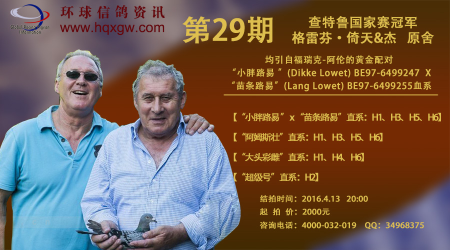 ![]() 格雷芬.倚天.杰曾获2013年比利时查特鲁Ⅱ国家赛成鸽组冠军!本期拍卖共6羽拍卖鸽全部来自格雷芬.倚天.杰先生原舍,均引自福瑞克-阿伦的精品血系,其中令人称奇的黄金配对“小胖路易 ”(Dikke Lowet) BE97-6499247 x “苗条路易”(Lang Lowet) BE97-6499255血系,该配对直子、直孙代中有不下40羽夺得过冠军! 福瑞克-阿伦夫妇舍内几乎所有的顶级赛将都是出自“黄金配对”的超级血系!该配对是取得全国性胜利的保证!由于“黄金配对”于2006年后已不再生育,因此此路血系变得尤为珍贵! ![]() 比利时豪强福瑞克-阿伦夫妇在短短的8年时间里拿下40次全省冠军,3次全国冠军。在夺得2010年拉索特年国家赛16576羽幼鸽冠军后,又一举拿下了2008-2011年间的第3项全国冠军大奖。如此辉煌的成绩充分证明了他们已经成为真正的顶级赛手的事实! 本场拍卖主要血统介绍: 【“小胖路易 ” BE97-6499247 x “苗条路易”BE97-6499255直系:H1、H3、H5、H6】 “黄金配对”:该配对直子、直孙代中有不下40羽夺得过冠军! 福瑞克-阿伦夫妇舍内几乎所有的顶级赛将都是出自“黄金配对”的超级血系! 2008年亚精顿 6033羽冠军、2010年图勒6698羽冠军、2004年亚精顿(雌鸽组)1340羽冠军 省际赛事:2011年蒙吕松1503羽冠军,亚军、2011年图勒651羽冠军,4,31名、2011年拉索特年1259羽冠军,亚军,29,49名 半国家赛和区赛:查特卢半国家赛8253羽冠军、亚精顿国家赛C区赛冠军,7,8,9,21名、2010年波治省际赛6573羽冠军、查特卢C区赛5993羽冠军、亚军布瑞福C区赛5934羽、冠军利蒙治C区赛1919羽冠军、苏亚克C区赛1254羽冠军、图勒C区赛2077羽冠军 【“阿姆斯壮”直系:H1、H3、H5、H6】 “阿姆斯壮”BE99-6366880: “阿姆斯壮”,斑,超级天才种公,“小胖路易”X“苗条路易”的外孙!“伊莲”半兄弟 荣获: AVE Regina评选全国鸽王冠军、《赛鸽杂志》评选全国鸽王亚军、查特路半全国3137羽9位、亚精顿半全国10461羽36位、波治全国大区6870羽39位、波治全国大区4445羽43位、利蒙治全国大区4931羽75位、查特路半全国11714羽102位 -“阿姆斯壮”是“玛瑞儿”、“琥珀”、“福乐多”以及“克劳帝奥”的父亲,他们分别荣获: 1.“玛瑞尔”:蒙特路康全省2424羽冠军 2.“琥珀”:亚精顿全省570羽冠军、全国雌鸽组1250羽冠军以及全国3949羽6位 ~直孙代荣获:2010年比利时全国幼鸽鸽王冠军(路易斯.佛海恩作翔) 3.“克劳帝奥”: 波治省际6573羽冠军、全国22476羽7位、查特路全省2424羽冠军、查特路全省1437羽冠军 【“大头彩雌”直系:H1、H4、H6】 “大头彩雌”B95-6143546: 灰,神奇雌鸽!派翠西亚第一种母 钻石级种母 本身作出全国冠军/亚军子代 直孙女“快车小姐” 直子“超级公”成绩:02年波治全国成鸽23952羽75位、00年拿永地区幼鸽1435羽4位、01年波治全国伊一岁鸽16119羽212位 【“超级号”直系:H2】 “超级号”B95-5130848:传奇鸽“绝世无双“半兄弟,曾获得: 4位 威尔森全省 4853羽 9位 利蒙治全省 914羽 20位 威尔森 4987羽 21位 圣.丹斯 1808羽 18位 利蒙治全省 1096羽 23位 波治全省 2151羽 本场拍卖鸽预览 H1 ![]() H2 ![]() H3 ![]() H4 ![]() H5 ![]() H6 ![]() 本期结拍时间2016.04.13 20:00 起拍价2000元 咨询电话:4000-032-019 QQ:34968375 拍卖大厅由此去>>> |