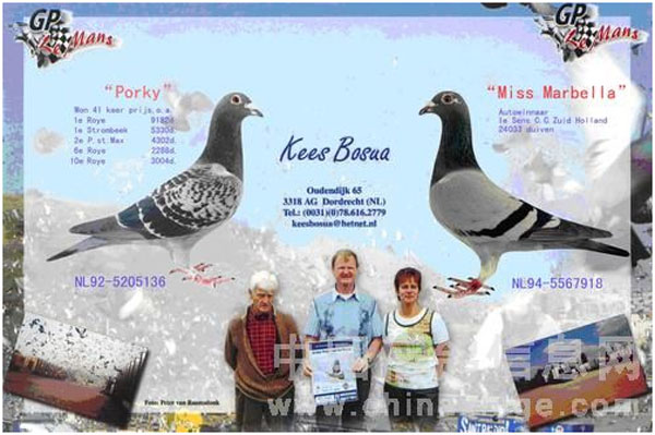| 几对基础配对是波西瓦这些年成功的保障,他们作育的很多后代都赢得了比赛。 第一对配对:“乌诺”配对,NL93-2690703(“晚生04”) X NL93-4165376(“乌诺雌”),1994年作出NL94-5567918“马贝拉小姐”,获得1994年荷兰桑斯24033羽冠军,赢得了一辆汽车;作出“雌鸽王”获:95年荷兰幼鸽鸽王7名;圣昆丁1277羽亚军;曼嫩3497羽4名;作出NL98-5870048“白头048”获:曼嫩5801羽亚军;波罗尼4144羽亚军; ![]() “乌诺”配对,NL93-2690703(“晚生04”) X NL93-4165376(“乌诺雌”) “马贝拉小姐”又与NL92-5205136“波基先生”组成了黄金配对“波基”配对。“波基”配对优秀子代成绩: 1 名查特鲁国家赛9337 羽; 1 名都佛 1473 羽; 1 名明德豪特 1490 羽; 10 名波治6346 羽; 东尼号(NL98-5870010):图斯 1019羽冠军、荷兰WHZB最佳幼鸽鸽王冠军!作出“NL02-5236718”获2005年波尔图奥林匹克荷兰中距离全国鸽王亚军; 依坦普斯号(NL96-5665985): 依坦普斯 1510 羽冠军; 22 号(NL96-5666022): 庞特圣麦克斯 2052 羽冠军; 艾薇塔(NL96-5666050):贝罗尼 2105 羽冠军、贝罗尼 1510 羽冠军、贝罗尼 2323 羽冠军; 奥尔良号 (NL97-5739316):奥尔良 4136 羽冠军; 里尓斯 (NL98-5870087):阿比斯 1649 羽冠军; 马瑞尔(NL01-5150323):波治 3020 羽亚军; 贝拉(NL01-5150250): 波治 3020 羽季军、荷兰WHZB 最佳雌鸽全国季军,全国鸽王8 名等; ![]() “波基”配对,NL92-5205136“波基先生”X NL94-5567918“马贝拉小姐” |