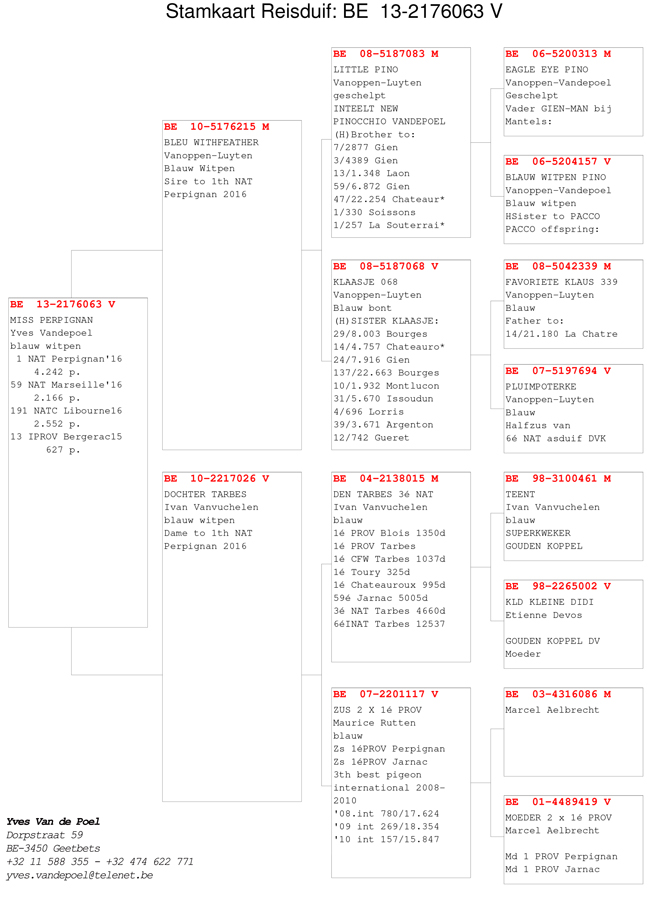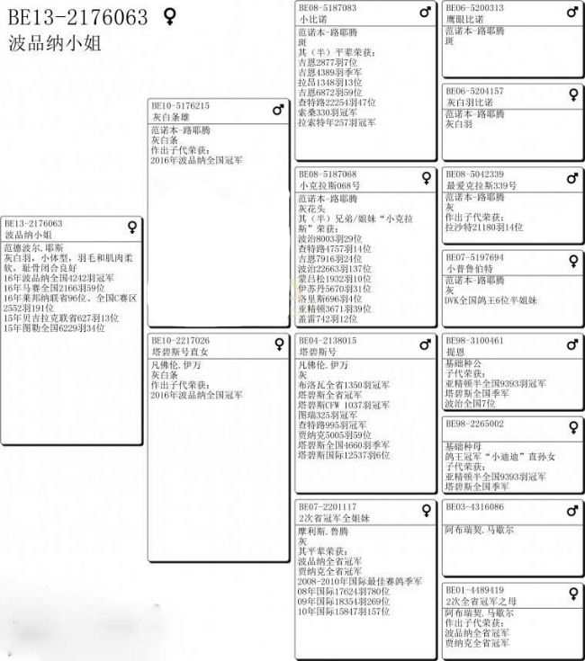 | 2013年我们在成都鸽展有幸与伊夫相识并与他合作,成功在环球信鸽网举办了两场专场网络拍卖。 2014年伊夫·范德布获得了查特鲁Ⅱ成鸽组冠军,其后,我们与伊夫长期保持着联系。 在刚刚结束的波品纳国际赛又取得了比利时国家冠军,国际组3名的好成绩。 伊夫·范德布的“博尔特小姐”(Lady Bolt BE11-2007582)2014年获得了查特鲁Ⅱ成鸽组4316羽冠军,其飞行空距为517.216km,平均分速达到1603.77米/分。 ![]() “博尔特小姐”(Lady Bolt BE11-2007582) 毫无疑问“博尔特女郎”为一羽顶级赛鸽。她在2013年的表现同样优异, 7场全国赛全部入赏顶级名次。 蒙吕松 (582 Km) 18568羽 166 亚精顿 (546 Km) 16325羽 531 波治 (466 Km) 9639羽 132 查特路 (516 Km) 4757羽 49 亚精顿 (546 Km) 5941羽 35 伊苏丹 (456 Km) 5670羽 30 拉索特年 (581 Km) 4144羽 119 由于以上的这些佳绩,2013年她获得了多项鸽王头衔。 ![]() “博尔特小姐”(Lady Bolt BE11-2007582)血统书 从她的血统书可以看到父系含有75%的桑杰士血统,她的祖父“超音速桑杰士663号”( Supersonic Soontjens 663 BE95-5062663)来自比利时吕门(Lummen)的托尼.马顿斯(Tony Martens),他不仅是一羽超级赛鸽,而且他的育种能力更加出色。“博尔特女郎”的母系为100%贺尔曼-裘斯特血统。可见这羽赛鸽的血统相当优秀。 波品纳国际赛比利时冠军,国际组3名。 在刚刚结束的波品纳国际赛,“波品纳小姐”( Miss Perpignan)完成了伊夫.范德布一生的梦想:赢得一场超长距离国际赛冠军。这是他在成功的职业生涯中获得的当之无愧超长距离比赛的胜利。 ![]() 伊夫·范德布 波品纳比赛是大部分超长距离鸽友认为的仅次于巴塞罗那比赛的最有声望的国际赛事。这场国际超长距离竞赛的收官之战是成功但艰难的经典之作。 本赛季的天气情况相当不错。鸽子在周五早上放飞,天气晴朗,中午的时候从北部到法国天空都非常清澈。波品纳是一场公平的比赛,没有太多困难。许多顶尖成绩在放飞的当天已经产生。 伊夫.范德布,运动场上的大牌赛手 伊夫.范德布的名字多年来一直与巴塞罗那比赛密切相关。这是他至今为止最喜欢的一场比赛,并且在那里已经取得了一些优异的成绩。但是伊夫一直在寻找新的目标,他决定参加大中距离及长距离比赛,并且在2014年获得了查特路全国成鸽组冠军。如今又为他的成绩榜单添上了一项著名的全国冠军奖项,获得了本赛季最后一场超长距离比赛,波品纳经典赛冠军。 伊夫总是对超长距离比赛充满激情。他已经在比赛中获得了一些优异的成绩,但是还没有赢得过最高级别的冠军。他在1995年获得了KBDB全国超长距离最佳鸽舍冠军的头衔。 伊夫终于于2016年7月29日完成了他的目标,赢得了波品纳冠军。他的冠军鸽是一羽鳏夫雌,她是一羽相当有天赋的赛鸽。“波品纳小姐”的打钟时间为20:00'20",总飞行空距935.038公里,以1221.74米/分的速度成为比利时速度最快鸽。 ![]() ![]() ![]() -“波品纳小姐”(Miss Perpignan BE13-2176063) 16年波品纳全国 4205羽 冠军 16年波品纳国际 12698羽 季军 15年图勒全国 6229羽 34位 16年马赛全省 215羽 4位 16年马赛全国 2166羽 59位 16年莱邦纳全国C赛区 2552羽 191位 15年贝吉拉克联省 627羽 13位 在“波品纳小姐”的血统里有个有趣的故事:最初,这羽雌鸽是被用于中长距离比赛,那是因为她的父亲是一羽出自范诺本-路耶腾鸽舍的雄鸽,并且在他的血统中有多羽中距离冠军。这就意味着她将是中长距离队伍中的一员。然而,去年她却多次进入长距离队伍参赛。考虑到她的血统,伊夫不太确定他是否能应付更长距离的赛事。最终,他决定用她上笼参加贝吉拉克比赛,而“波品纳小姐”在这场比赛中发挥出色。激励成为关键。 今年同样的事情又发生了,她的身体素质在七月获得明显改善。她在波品纳冠军之前已经获得了多次莱邦纳及马赛高位入赏。她真是一羽非常强劲的优秀雌赛将! 这是她的血统: 父亲:“灰白羽雄”(Blauwwitpen Vanoppen-Luyten BE10-5176215),范诺本-路耶腾原环 “小比诺”( Little Pino BE08-5187083,“新皮诺丘”回血)x“克拉斯雌068号”(Klaasje 068 BE08-5187068,半姐妹“克拉斯雌”获得:查特路4757羽14位,吉恩7916羽24位,波治8003羽29位,波治全国22663羽137位,伊苏顿5670羽31位,蒙吕松1932羽10位等…)直子。这是范诺本-路耶腾的顶尖品系。 母亲:“塔碧斯号直女”(Daughter Tarbes BE10-2217026) 她来自凡佛伦.伊万(Ivan Vanvuchelen)血统。她出自一羽超级雌鸽“塔碧斯号”( Den Tarbes BE04-2138015,塔碧斯全省冠军及全国4660羽季军,布洛瓦全省1350羽冠军,查特路995羽冠军,图瑞325羽冠军,贾纳克半国家5005羽59位)x“灰鲁腾”( Blauw Rutten BE07-2201117,出自摩利斯.鲁腾)。她荣获波品纳全省冠军及贾纳克全省冠军,是一羽100%阿布瑞奇的血统鸽。 ![]() “波品纳小姐”血统书 ![]() “波品纳小姐”中文血统书 伊夫上笼了2羽赛鸽参加波品纳比赛,并且他们都获得了高位入赏。他还没有获得过巴塞罗那比赛的全国冠军,仍然希望有一天能得偿所愿。但是获得本次第二个最有声望的经典超长距离比赛冠军仍是非常骄傲的。祝贺伊夫! |