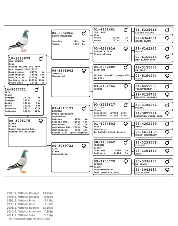 | 图勒 2014 盖比获得一岁鸽组全国冠军 冠军鸽是在比利时时间星期五14:37:57(换算北京时间请加6)归巢,翔距614.934 km, 创下平均分速1342.8 米/分 ![]() 同时成鸽组的冠军也是使用盖比血系的鸽友获得(巴特-狄布喜) 冠军鸽是在比利时时间星期五14:05:44(换算北京时间请加6)归巢,翔距571.389 km, 创下平均分速1342.13 米/分 ![]() ![]() ![]() ![]() 2016年盖比.凡德纳比在查特路国家赛 赢得查特路全国成鸽组25,126羽4位。 此次查特路比赛天气不错,只有轻微东北风。这样好的比赛条件对于顶级赛鸽非常适合。凡德纳比的鸽子再次博得了众人的眼球,最好的成绩为查特路全国成鸽组25,126羽4位。 “新闪电号”半兄弟夺得查特路全国4位 首羽回到登特尔赫姆(Dentergem)的参赛鸽是一羽两岁雄鸽,打钟时间为13:22’02”。他的名字叫“凯因”(Kain),在2015年就已经崭露头角,拿下了波治全省冠军的头衔。他的血统也不错,同父半兄弟为2013年KBDB全省鸽王冠军“弗鲁姆”(Froome),他的母亲“齐亚娜”(Kiana)也是著名“新闪电号”(New Bliksem)之母,“新闪电号”曾获得2014年图勒全国一岁鸽5,731羽的冠军。 ![]() -“凯因”(Kain BE14-3067021) 2016年查特路全国成鸽组25,126羽4位 2015年波治全省一岁鸽组1,415羽冠军 凯因的血统更为特殊,父亲是奶酪血统x奥林匹克003,而母亲来自于盖比自己的“闪电号”的一羽女儿。 ![]() 但以上还并非全部:就像我们说过的,凡德纳比赛鸽在其他鸽舍也赢得了无数重要的奖项和全国冠军。下面是仅仅2013年凡德纳比鸽系赢得的部分全国赛冠军: -尼古拉.巴斯考特(Nicolas Bascourt) : 利蒙治全国14271羽冠军 -伯特.凡登伯格(Bert Van Den Berghe): 阿让(波尔多)全国赛5507羽成鸽组冠军 KBDB全国成鸽组鸽王亚军 全国中长距离鸽王成鸽组12位 -乔尔.佛斯豪特(Joël Verschoot): 阿让全国赛5283一岁鸽冠军 布瑞福全国8331羽成鸽冠军(并列) 2013年KBDB比利时综合鸽舍亚军 -杰克.佛薛尔(Jacques Verschuere): 拉索特年全国11236羽一岁鸽冠军 布瑞福全国8331羽成鸽冠军(并列) -德克.摩恩(Dirk Moens): 波治全国赛13588羽一岁鸽冠军(2013年5月) -托尼.利文斯(Tony Lievens): 波治全国11883羽一岁鸽组冠军(2013年7月) 2013年总共有不少于13项全国冠军与凡德纳比血统有关,包括获得波提尔全国冠军的米斯彼勒父子(J. & G. Mispelaere), 获得盖雷全国冠军的弗兰基.阿普曼(Franky Appelmans) (1st Nat Gueret),图勒全国冠军伊万.凡佛伦(Ivan Vanvuchelen), 亚精顿全国冠军马提亚斯.库勒(Matthias Coel)和获得伊苏丹全国冠军的亚伯特.德瓦(Albert Derwa)。这是令人惊叹的成绩!这些成绩完美地说明了2013年是盖比鸽系发挥特别精彩的一年。 神奇的小鸟,神奇的盖比 世界看中国,中国看开创!开创者国际赛鸽俱乐部堪称全球顶级赛场,鸽界最高学府!在这个全球最激烈的赛场上,来自全国各地强豪和鸽界菁英将在北京开创者这片土地上演赛鸽史上最强大的空中争霸赛!天津稳赢-何宾勇夺开创4关综合总冠军!二关暗指总冠军、三关暗指总冠军、四关暗指总冠军。疯狂小鸟05568赢得奔驰四辆。现金几千万! ![]() ![]() ![]() “神奇小鸟”其母(B012-3160712)也是纯盖比血系,其父B06-12167006“西克斯图斯”:白腹号多重近亲 全兄弟“提图斯”作出:“米凯全国号”波治3489羽6位、杜尔斯4165羽11位、蒙吕松7828羽15位、查特鲁15902羽36位、波提尔全国13813羽34位、利蒙治全国17735羽72位。 其母B09-3095238“碧昂卡”:“白腹号”外孙X“闪电号”直女 盖比成功之路1 依靠自己的鸽系与天赋赛鸽混血 为了培育新鸽系,盖比通常以自己的冠军鸽(“娇小号”、“白腹号”、“闪电号”、“鲁迪”、“超级罗密欧”和很多其他名鸽构成的基础鸽系)来组成新的种鸽队伍。他依靠自己的成功鸽系在过去30年中的很多比赛中取得优异的表现。最优秀的种鸽使用人工授精来与最佳种雌鸽进行配对,这让盖比能够在较短的时间内繁育更多的后代。 盖比是从来不会停下脚步的鸽友,他总是寻找能够改善鸽系的力量,并保持与对手的领先优势,例如 “闪电号”的母亲“莉塔”(Rita)和“凯西”(Kathy),这是附近鸽友诺尔.利本斯(Noël Lippens)的杰出种鸽“活力号”(Vital)的2羽直女。 “福洛雌”(Florke),英格斯兄弟(Jos & Jules Engels),伯特.凡登伯格的2013年全国中长距离鸽王12位“米歇尔全国号”(Miche Nat.)的母亲。 “超级鸽王”(Super As),塞尔-拉泊特(Serré-Lapporte),2004年KBDB全国中距离鸽王亚军。 “摩利斯”(Maurice),摩利斯.卡沙特的苏雅克全国赛冠军“纳斯达克”(Nasdaq)直子 “贝吉拉克先生”(Mr. Bergerac),法国全国鸽王冠军 克里斯.赫伯瑞的2005年KBDB全国长距离鸽王亚军的后代,包括“冠军085/07直女”(Dochter Champion 085/07)作育子代“间谍号”(Spy)获得南非太阳城百万美元大赛亚军,子代“格力斯”( Goliath)作育子代为伯特.凡登伯格获得2013年波尔多全国赛5507羽成鸽组冠军。 亚里.诺伯特(Norbert Ally)的“露娜”(Luna) 克里斯蒂安.汉纳斯(Kristiaan Hennes)的“霸龙全兄弟”(Broer Ballon,“班吉”的父亲) “法尔考”(Falco),登特尔赫姆的顶级赛鸽和种鸽(出自艾瑞克.佛曼德鸽系) 盖比成功之路2 遍布全球的盖比粉丝群,是维持盖比王朝巨大的基因宝库和筛选器。 他也将一些自己的鸽系引进回来,通常是采取合作育种的方式,这是詹森等前辈没能做到的。 他也将一些自己的鸽系引进回来,通常是采取合作育种的方式。例如“闪电号”与杨.胡曼斯的“